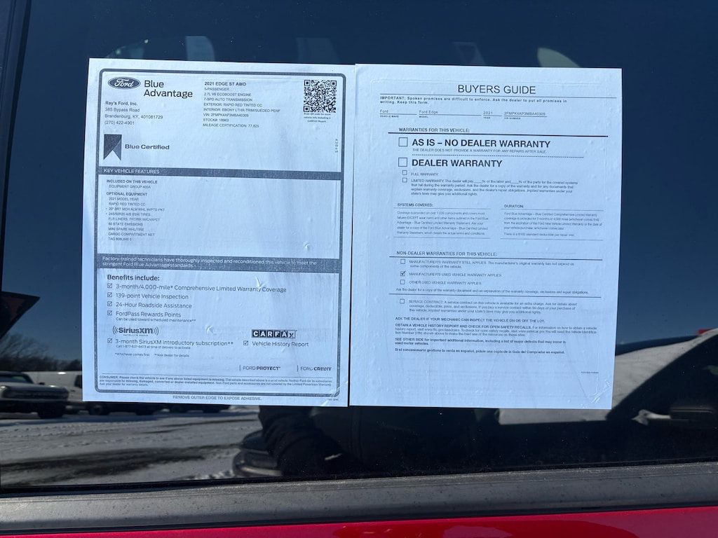 Take a joy ride in this vibrant Red 2021 Ford Edge! Equipped with a powerful 2.7L V6 EcoBoost engine, this sleek SUV is ready to hit the open road with its Automatic Full-Time All-Wheel Drive system. The Sport Tuned Suspension and responsive Electric Power-Assist Steering ensure a smooth and dynamic driving experience.Step inside the plush interior featuring comfortable Leather/Miko Suede seats and a Leather/Metal-Look steering wheel. Stay connected with the integrated 3 LCD monitors and stream your favorite tunes through the premium 12-speaker sound system.Safety is paramount with features like Blind Spot Information System, Automatic Emergency Braking, and Cross-Traffic Alert included in the innovative Ford Co-Pilot360 suite. Plus, enjoy peace of mind knowing a detailed Carfax report is available for this vehicle.Whether you're cruising around town or embarking on an adventure, this stylish Ford Edge offers a perfect blend of performance, comfort, and technology to elevate your driving experience to the next level! Visit Ray's Ford online at www.raysford.com to see more pictures of this vehicle or call us at 270-422-4901 today to schedule your test drive.